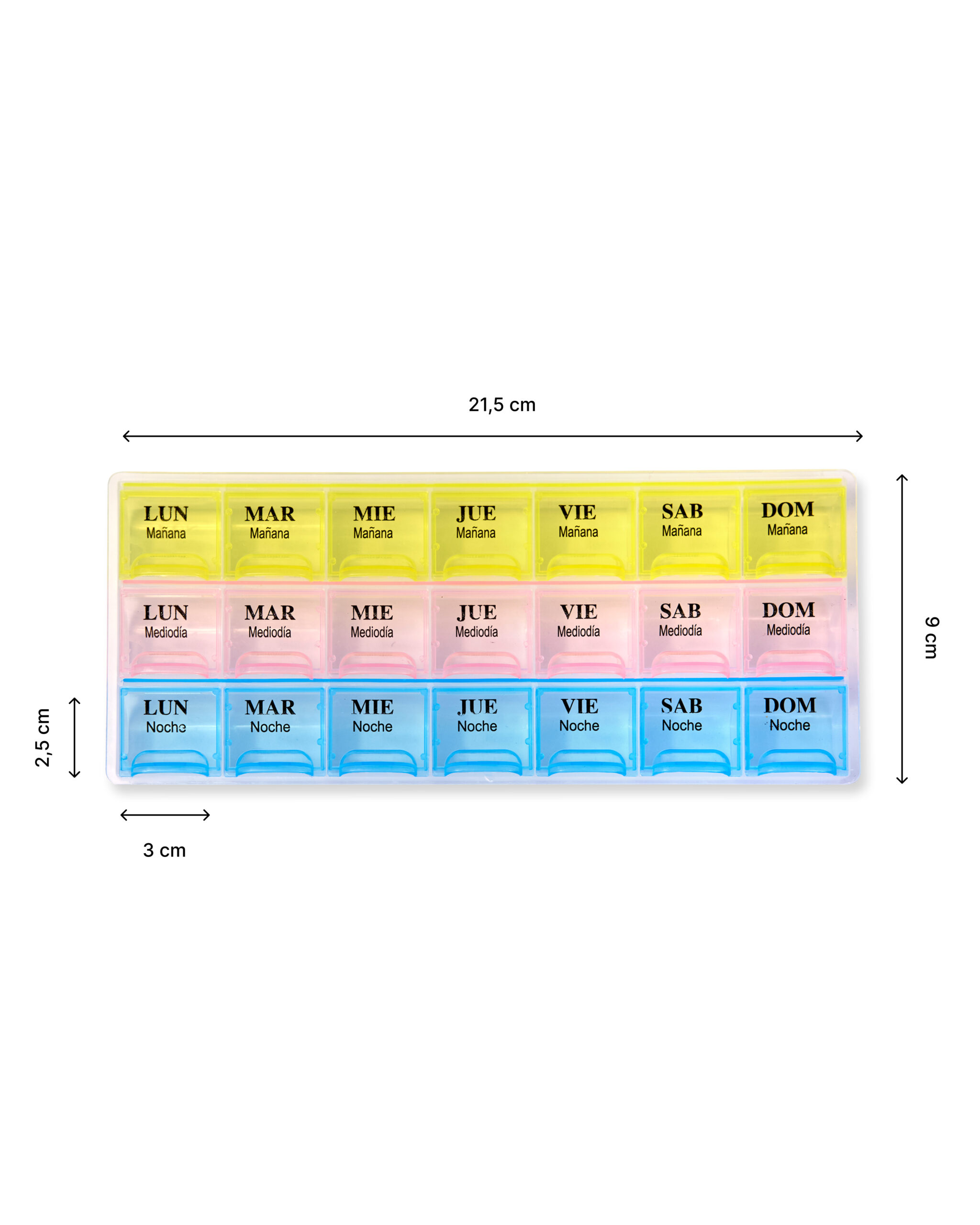 ✔ Organización Eficiente: 21 compartimentos separados para distribuir las dosis diarias.